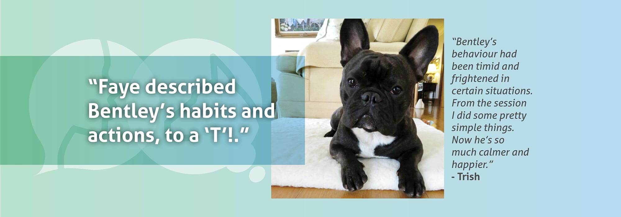 “DESCRIBED BENTLEY’S HABITS AND ACTIONS, TO A ‘T’!”“Faye described Bentley’s habits and actions, to a “T”! I have NO DOUBT that he was talking to her. Faye’s description of him, the way he engages with people his likes and dislikes etc. were all so accurate. Before the session Bentley’s behaviour has been timid and frightened in certain situations. From the session I felt reassured that there is nothing majorly wrong in Bentley’s life. Afterwards we did some pretty simple things – as suggested by Bentley – and he’s now so much calmer and happier.”
